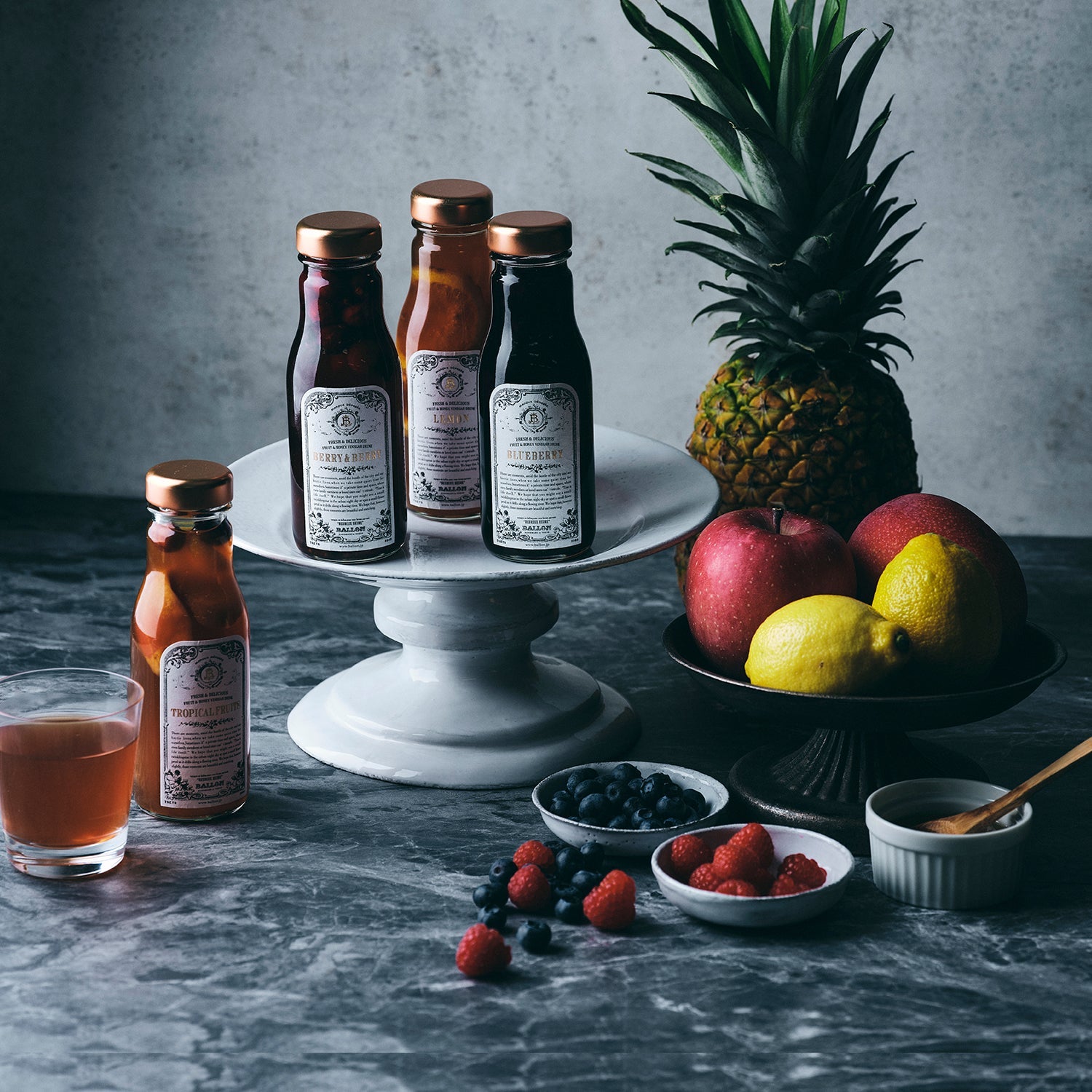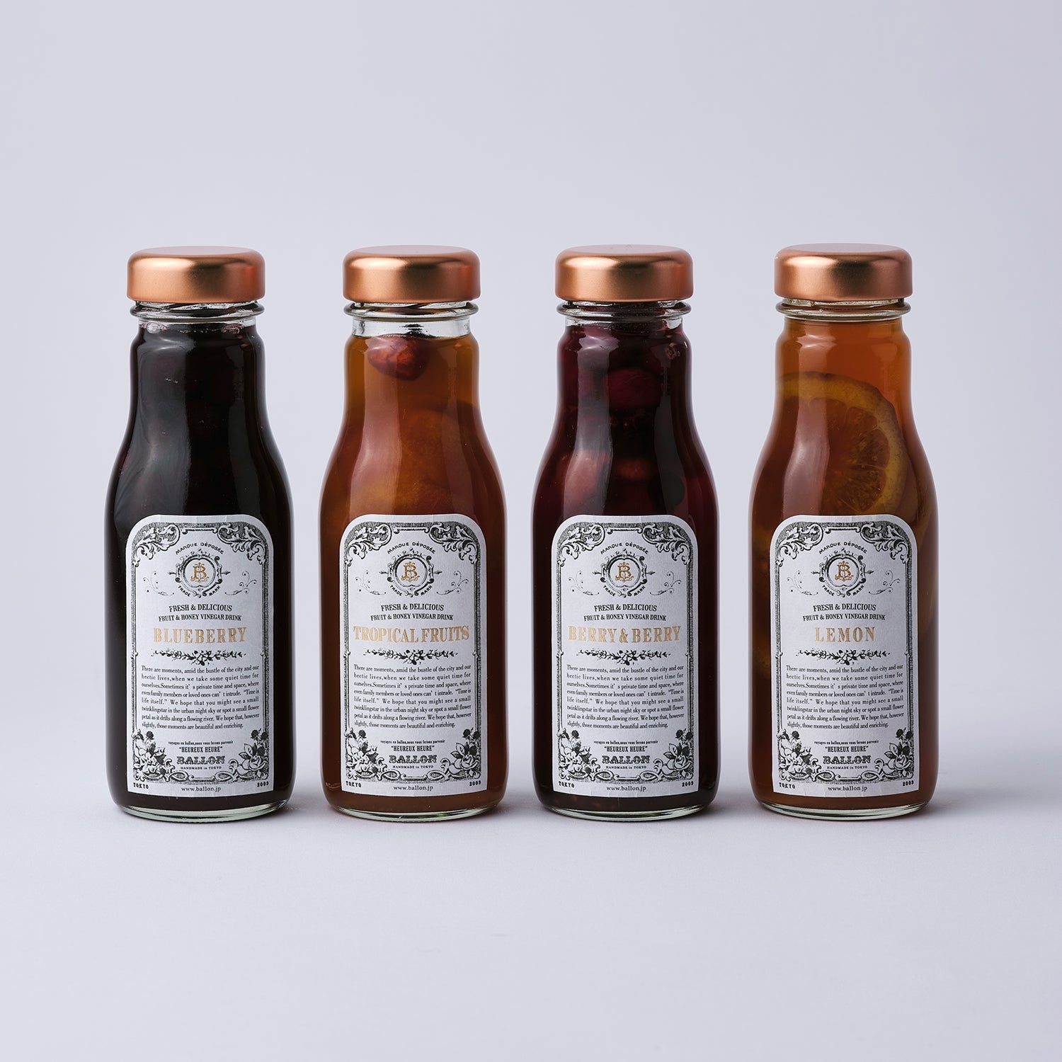 BALLONのフルーツビネガードリンクは、砂糖不使用、フルーツとハチミツを漬け込み、自然な甘味とフルーティーな味付け。