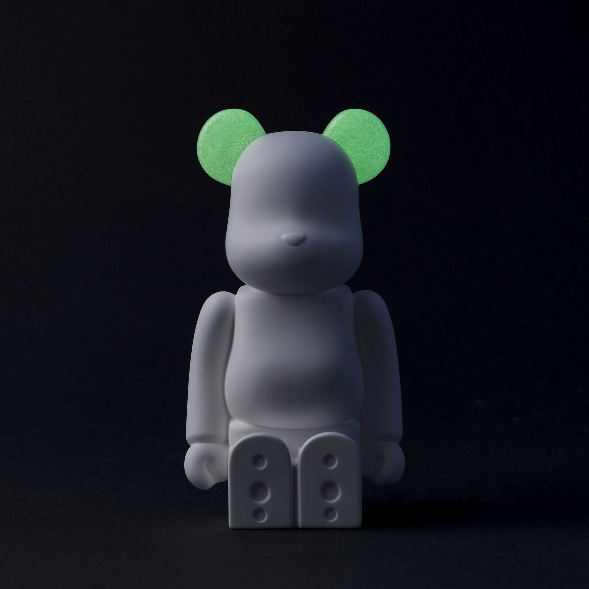 新作は「光」と「影」という二律背反する深淵なテーマとし、「光」をイメージしたWHITE、影をイメージしたGRAYの2色展開。蓄光素材により、太陽や蛍光灯などの光を吸収・蓄積し、暗い場所で見ると耳が発光します。発光色もそれぞれ異なります。