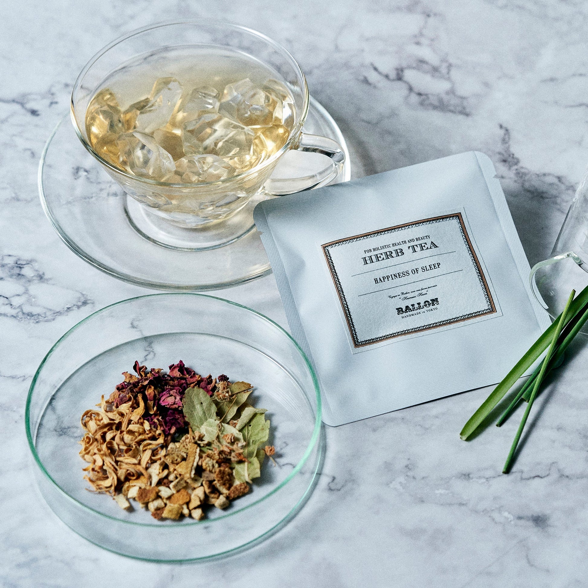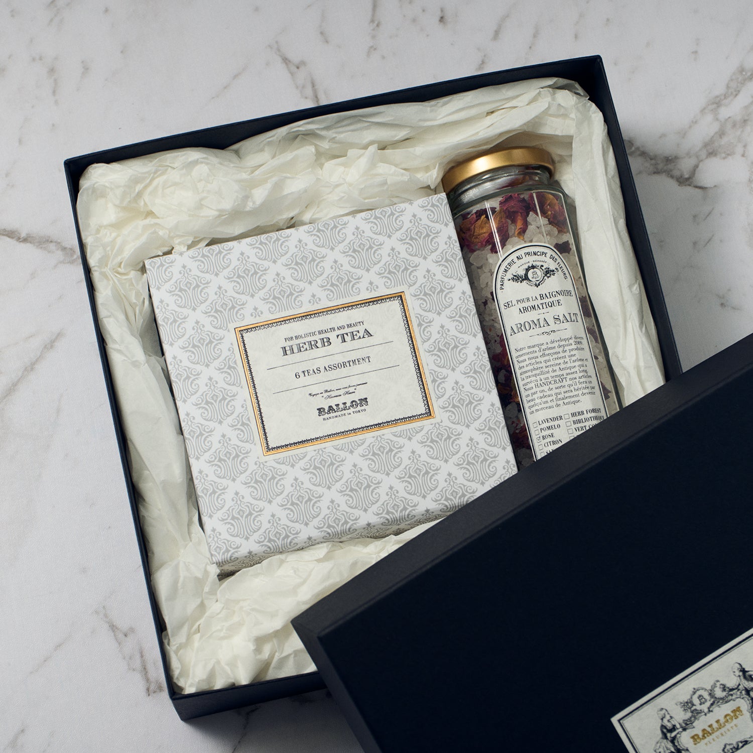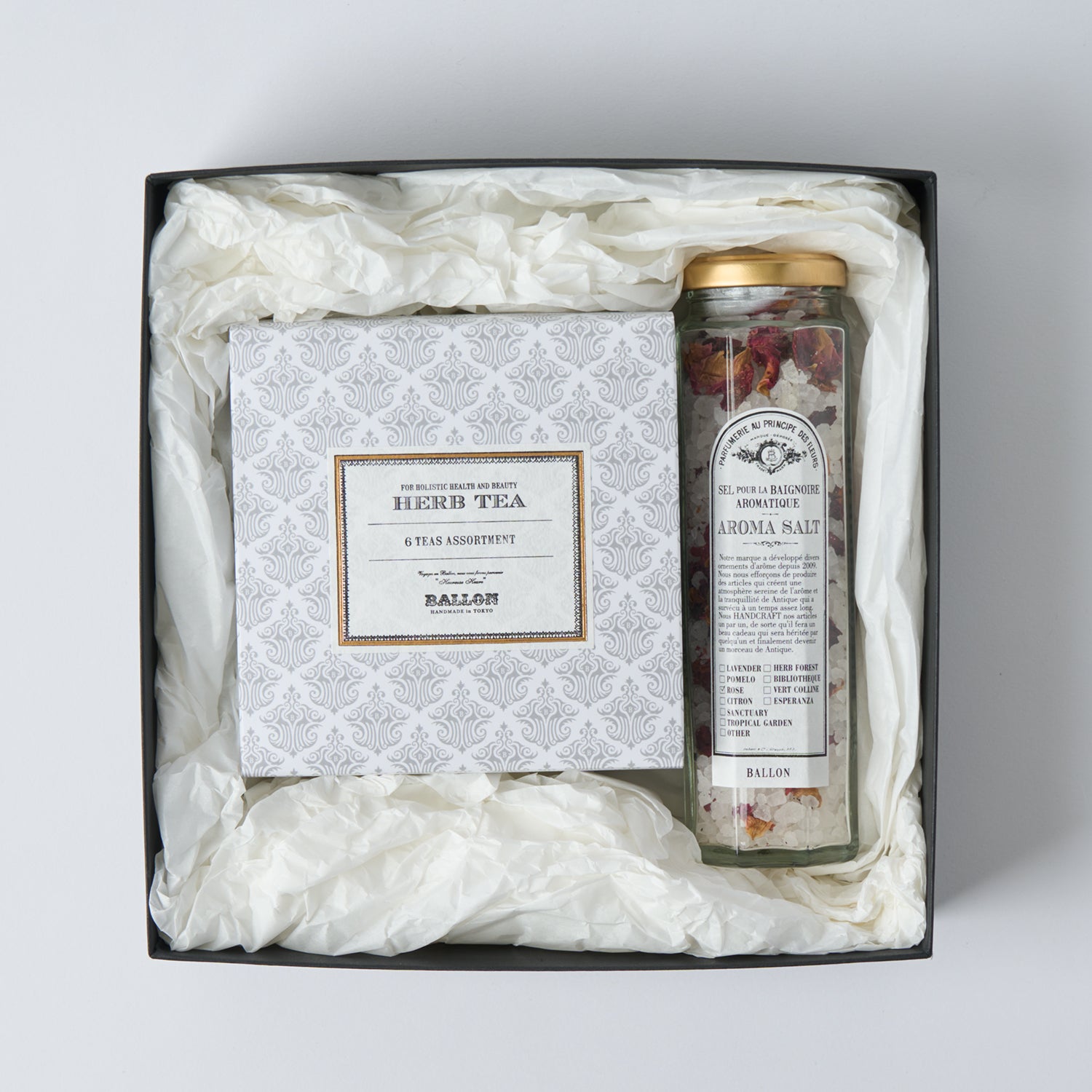 BALLONのハーブティー6種全種類をお試しいただけるアソートセットとアロマバスソルトのローズがセットになったギフトセット。