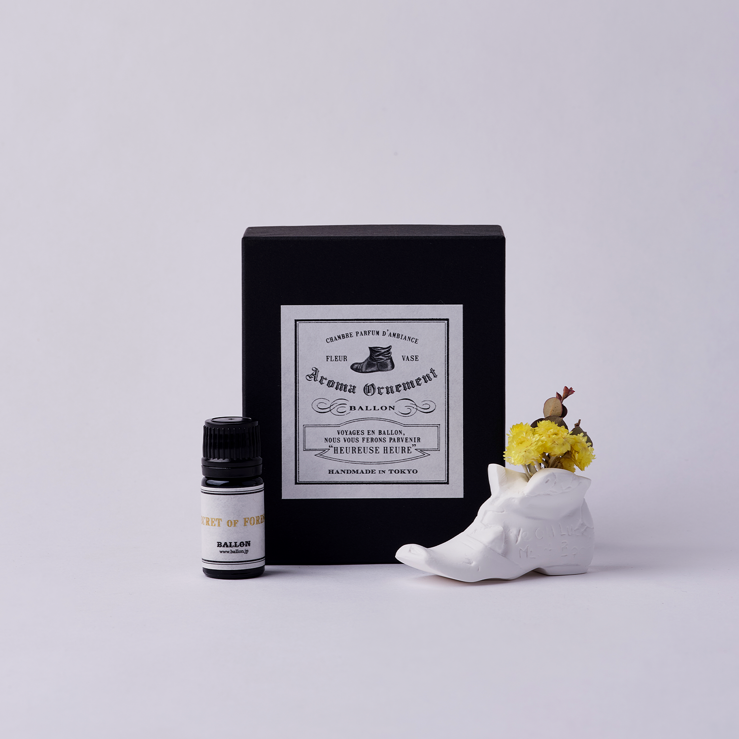 ドライフラワーとプリザーブドフラワーから 作られたミニブーケと、森に咲く美しい花とカシスの甘美な香りを放つ“Secret of Forest(シークレット オブ フォレスト)のフレグランスオイル5mlが付いています。