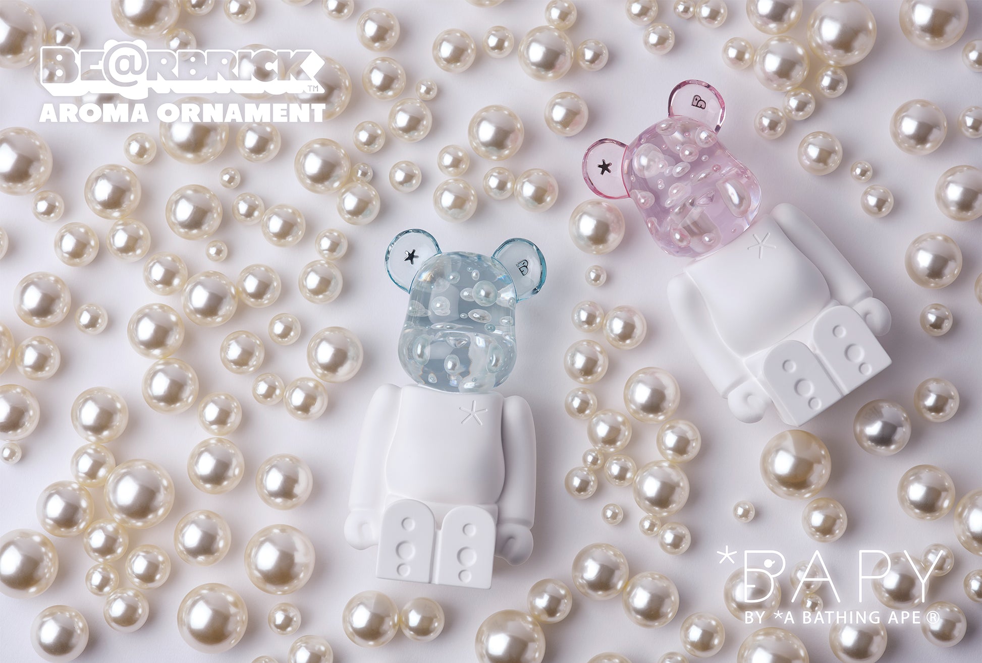 The new item, featuring BAPY BY *A BATHING APE®️, presents two colors typical of BAPY, pink and blue. The head contains pearls and metal pieces of different sizes while the body, made of plaster, is a simple design. The scents were developed specifically to match the colors of the heads.
