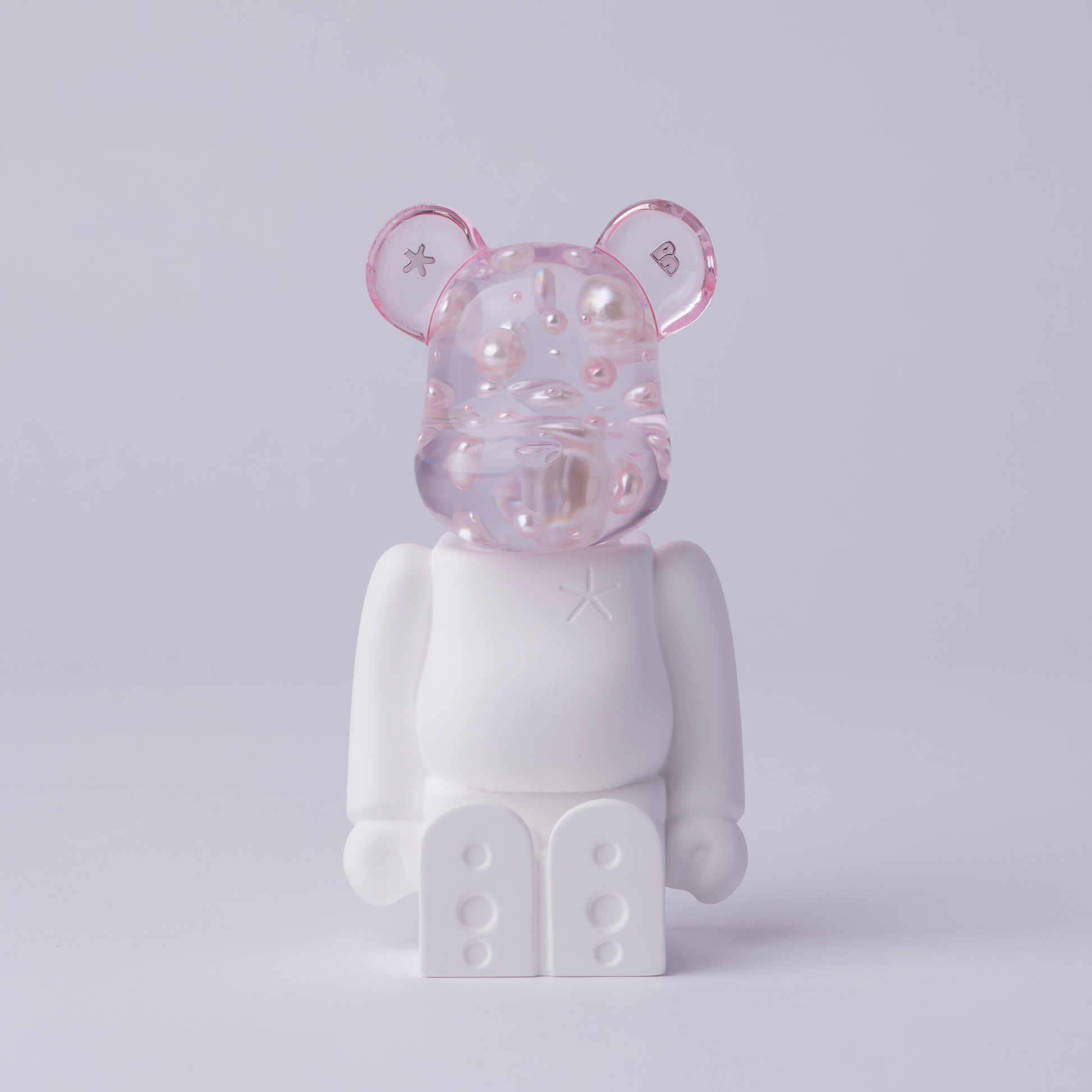 新作は、BAPY BY *A BATHING APE®️を迎え、BAPYらしいPINKとBLUEの2色展開で表現しました。様々な大きさのパールとメタルパーツを封入した頭と、シンプルな石膏のフロントデザイン。香りはそれぞれの頭のカラーのイメージに合わせたオリジナル調香。