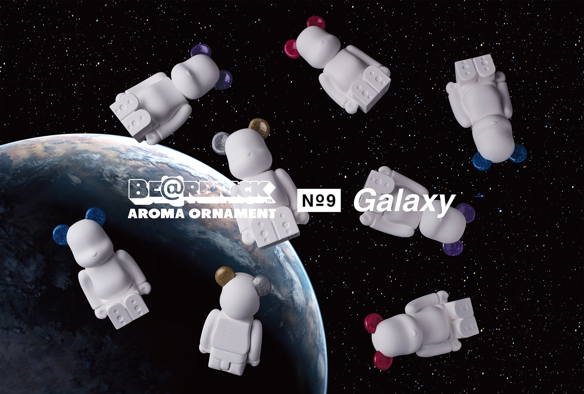 BE@RBRICK AROMA ORNAMENT No.9 Galaxy is a series featuring glittered ears, reminiscent of a galaxy. The design of the body utilizes a mystical pure white color to emphasize the aesthetics of the contour just like the No. 0 series. The new glitter colors for 2021 are the following: SILVER GOLD (each ear colored differently), PINK, AQUA and PURPLE. All four colors share the same scent, featuring an aroma based on what outer space may smell like.