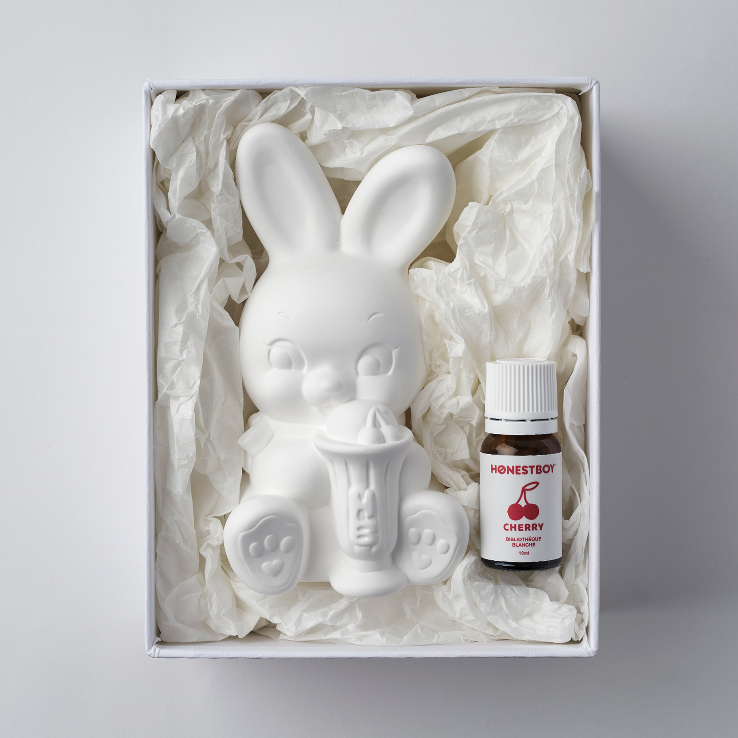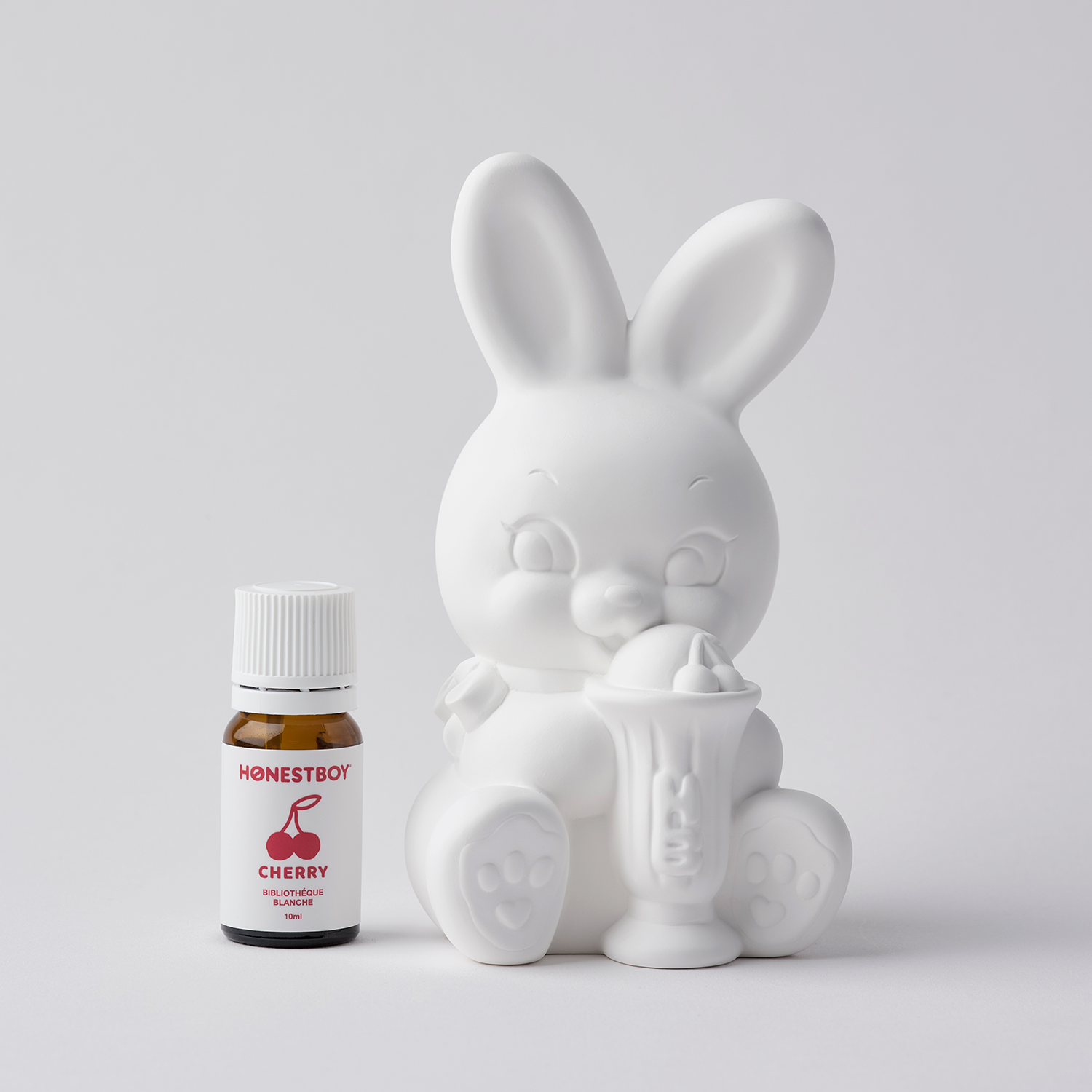 The original design features Roger, the iconic rabbit of HONESTBOY ®, holding an ice cream with cherries, the theme of this fragrance.