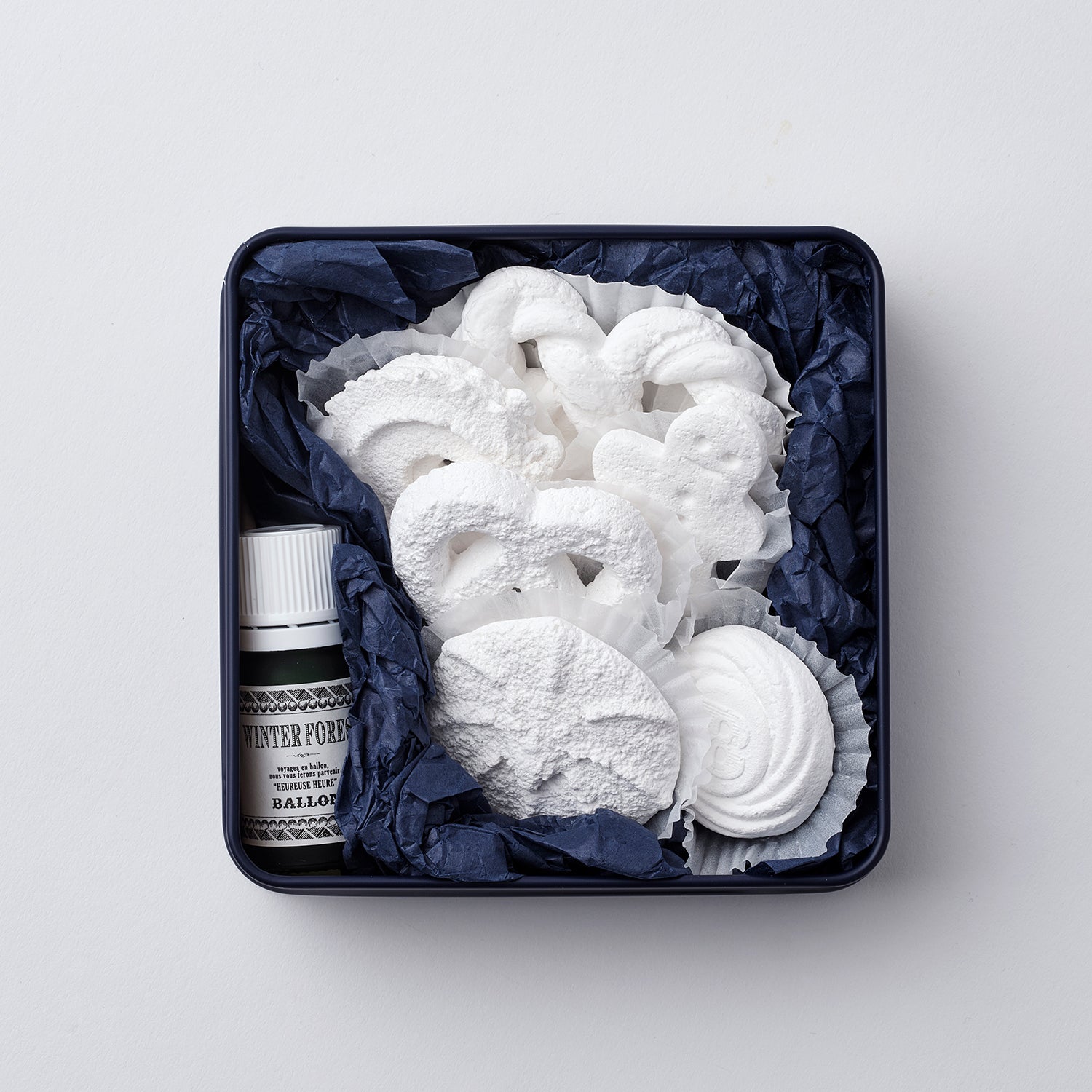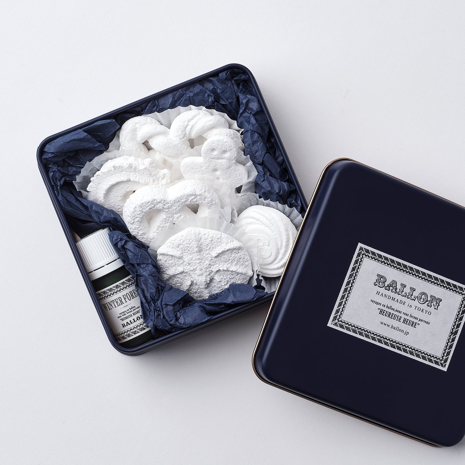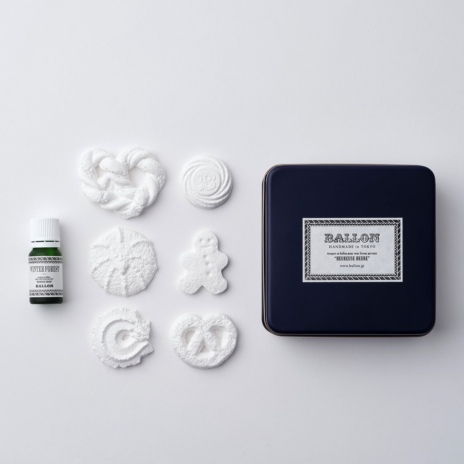 クッキーやプレッツェルのデザインのアロマオーナメントが詰まった、BALLONらしいクッキー缶です。